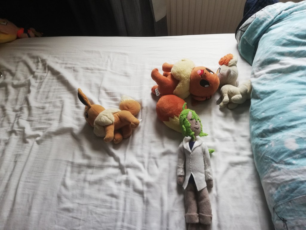 Maar in de zomer van 2016 was die hele Pokémon GO hype en dacht ik: ” Zal ik dan nu eindelijk een Eevee knuffel bestellen?”. Maar dat vergat ik weer. Tot ik op een moment het karakter Natural Harmonia Gropius (ofwel: N , Waavan ik dankzij mijn moeder nu ook een knuffel heb!) uit Pokémon Black en White ging maken in Sims en hem in mijn hoofd een huisdier moest geven (het huisdierenpakket voor De Sims 4 kwam pas in 2017 uit en ik bedacht dit in 2016); dus toen kwam Eevee weer bovendrijven. Uiteindelijk heb ik vlak voor mijn buitenlandse reis een Eevee pluche besteld met als doel die op het gezicht van een van mijn vrienden te zetten terwijl hij sliep, (eigenlijk gewoon als grap dus.)