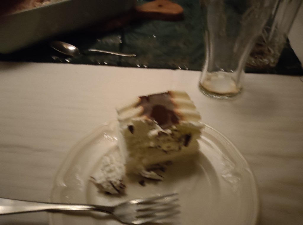 Vanavond heb ik met mijn familie kerst gevierd en dat was best leuk, iedereen heeft weer leuke (en minder leuke) cadeautjes gekregen! Maar we begonnen de avond natuurlijk met een lekker kerstdiner, ik heb geen foto van het diner zelf. Maar wel van het toetje; Vienetta-ijstaart!