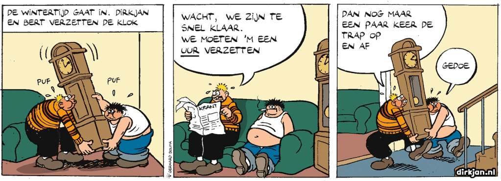 Vannacht is de wintertijd ingegaan en ik moet zeggen; ik ben zeer teleurgesteld dat mijn ouders juist deze week hebben uitgekozen om op vakantie te gaan. Want ik vind dat ik bij het verzetten van de klok thuis moet zijn (of tenminste in de CET-tijdzone) en niet op vakantie (Ik zit nu in UTC+0 (of voor oude lullen, zoals de generatie van mijn ouders: GMT+0). Bovendien wilde de regering van Nederland een paar jaar geleden (2018) af van het verzetten van de klok omdat het echt geen ene kut (sorry voor het kleurrijke taalgebruik) oplevert, en mensen er alleen maar depressief van worden. Toen is zelfs aan mensen gevraagd wat ze wilden en de meesten kozen zomertijd, want ja, “zomer”. Mensen hoorden eigenlijk: “Op de fiets door de natte sneeuw kouwe klauwen depressie-wintertijd” en “Cocktail zwembad sexfeest-zomertijd”! En tja, dan is de keuze makkelijk, nou snap ik ineens waarom ouderen met genoeg geld in Nederland in de winter massaal vluchten naar een of andere duffe archipel voor de kust van West-Afrika, of naar een andere Spaanse archipel voor de kust van Marokko! Maar persoonlijk ben ik meer voor de wintertijd, want dat is onze standaardtijd. Ik (of eigenlijk mijn alterego Lucas Hearsay) ben namelijk al sinds mijn jeugd geinteresseerd in hoe dat nou werkt met klokken en tijdzones en zo. Dat wisten jullie nog niet hé? Leren jullie ook nog eens wat van mij! En omdat we de klok deden verzetten gisterennacht hier even een heel grappig stripje daarover!