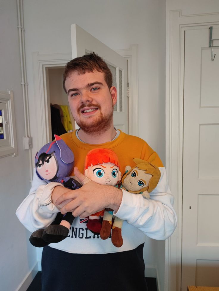 Wat dan wel weer speciaal is, is dat ik vandaag ga sporten, want normaliter doe ik dat op maandag en niet op vrijdag! Daarover zo meer! Want ja, eerst ga ik het hebben over mijn knuffels op de foto, en in het bijzonder mijn knuffel van Hiro Hamada (die in dat paarse pakje), want die heb ik vandaag speciaal meegenomen, niet alleen omdat hij Luc Nefario moet voorstellen in mijn verhalen, maar ook omdat ik de serie van de film Big Hero 6 aan het bingewatchen ben op Disney+! En daarom is die opluche nu een van mijn favoriete pluches van het moment geworden, en ja, toen moest ik er wel een Sims-personage aan verbinden, en dat werd dus Luc Nefario, omdat hij qua genialiteit en intellect en persoonlijkheid het meest overeenkwam met Hiro Hamada! En verder heb ik mijn pluche van Nami (want nieuw!) en natuurlijk onze goede oude vriend Joshua bij! Omdat dat mijn twee andere lievelingsknuffels zijn van het moment!