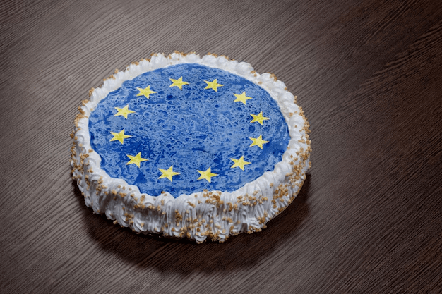 Vandaag is het Europadag (en daarom 🎶Europa-pa, Europa-pa🎶), de dag waarop we de eenheid van Europa vieren, en daarom heb ik… Nou, helaas geen Europataart gemaakt, zoals ik dat eigenlijk wilde doen vandaag; ik heb vandaag pizzabagels gemaakt voor de lunch; gewoon, omdat een collega van mij die een kaakoperatie heeft gehad en nu weer kan eten dat wilde! Dus ja, het werden pizzabagels! Ook niet erg, die taart komt er wel een keer! Hij moet er ongeveer uitzien zoals onderstaande; dat zou lekker zijn! Maar dan nog; Hoe overtuig ik mijn kookmaatje; die van hartige en pittige smaken houdt, om een taart met me te bakken? Of nou ja, misschien kan ik volgend jaar iets regelen bij Petit Malden! (Want dit jaar is het al te laat) bovendien moest ik mijn kookmaatje ook nog eens uit gaan leggen dat het vandaag Europadag is! Want hij wist niet dat het vandaag zo is; terwijl, ik vier het ieder jaar! Meestal door een plushie te bestellen (ook al viel dat nu samen met die gaming rig) en door Europapa van Joost Klein op vol volume te draaien! (Zeg maar niet standje doven en slechthorenden, niet standje sorry buren, maar gewoon ronduit “standje ramen die trillen”, dus echt KEIHARD KNETTERHARD!)