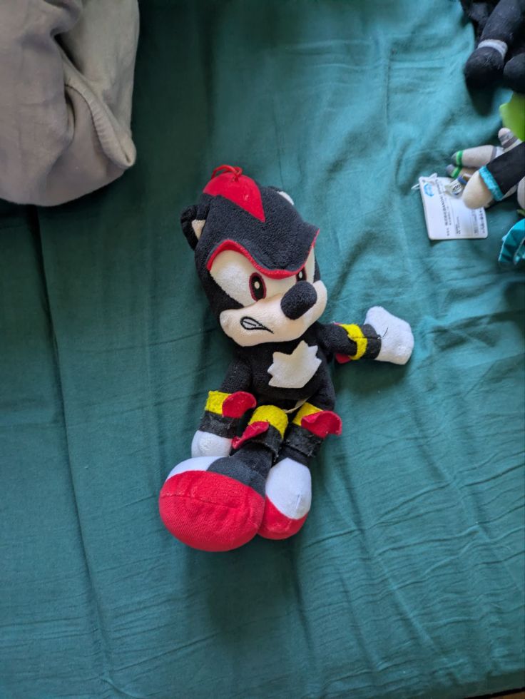 Ik dacht dat gisteren gewoon een normale dag ging worden… Gewoon naar TriUnity, gewoon sporten, gewoon mijn normale dingetjes doen! En natuurlijk mijn Duo-plushie van Duolingo aan mijn sportmaatje geven! Nou, dat werd compleet van mijn sokken geblzen, en wel omdat ik welgeteld rond de 10 plushies van mijn sportmaatje kreeg! Hoe dat kwam? Nou, Mr. Maestro had een vriend en die zat met allemaal plushies waar zijn kinderen niets meer mee deden, en toen zei Mr. Maestro dat hij een vriend had (ik) waaraan hij de plushies kon geven omdat ik plushies spaar! En dus had Mr. Maestro niet alleen een nieyuwe plushie, maar ik ook; en het waren er echt een HOOP, van Angry Birds-plushies tot beertjes en hondjes en pluches van Squid Game en het personage Huggy Wuggy, maar een daarvan stond toch echt bovenaan mijn lijst en dat was toch echt mijn pluche van Shadow van Sonic the Hedgehog! Daar was ik echt al vrij lang naar op zoek, had ik zelfs €30 voor uitgetrokken, maar nu kreeg ik m dus gewoon; voor gratis, voor welgeteld niente euro! Maar goed, nu wil ik Knuckles, Sonic, Amy en (als ik m nog niet heb) Tails ook bij de verzameling hebben, en hieronder zien jullie een foto van Shadow, maar eerst; omdat ik een geluksdag heb, een verplicht plaatje van Guus Geluk!