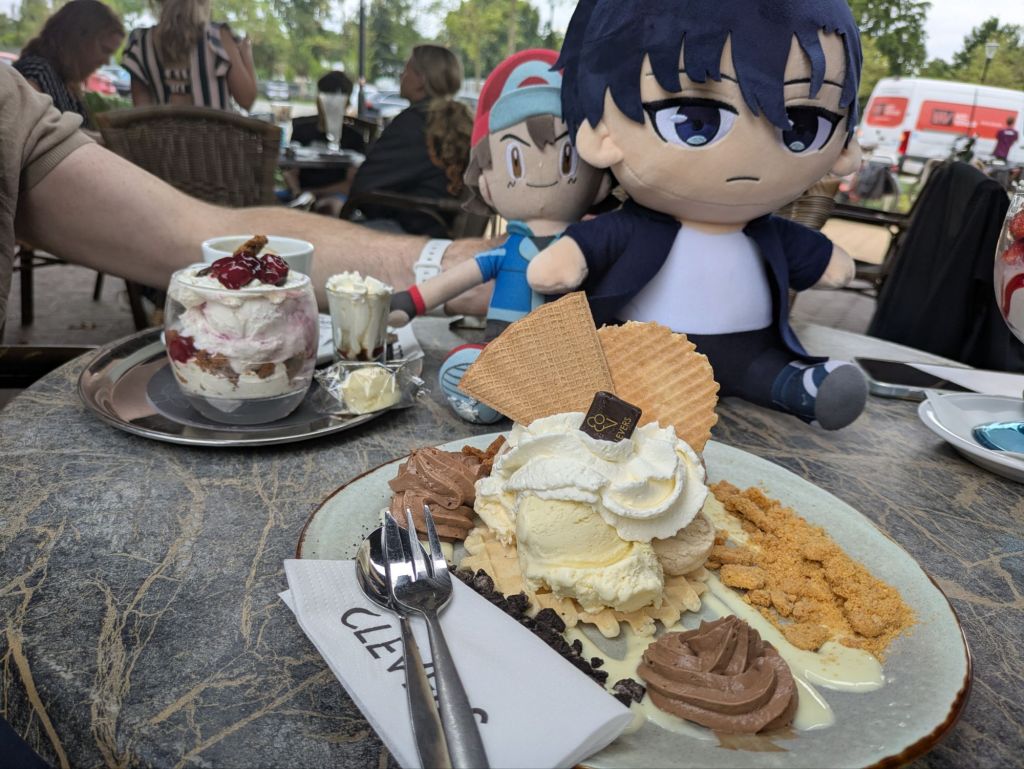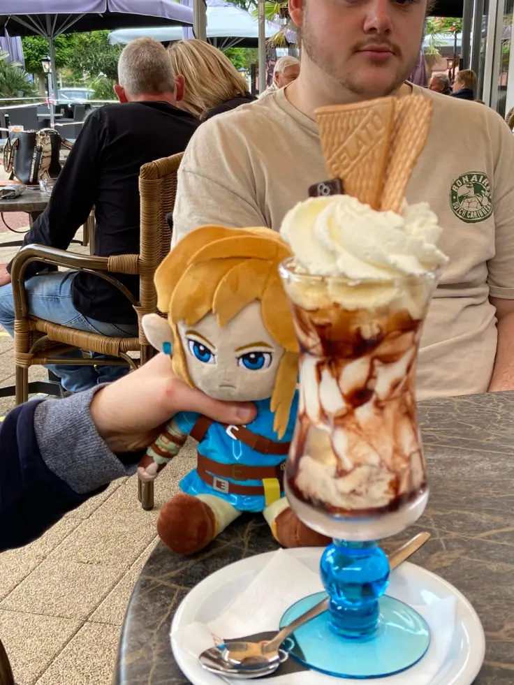 Maar goed; na die wandeling (en even uitpuffen bij Dushi onderweg waar ik lekker een “dinch” van nacho’s en snacks naar binnen heb gewerkt) gingen we dan eindelijk naar Clevers! En nu komen we op het moment supreme want doet dit jullie niet ergens aan denken; dat ik net een nieuwe pluche heb die gebaseerd is op een bepaalde denkbeeldige vriend en dat je dan bij Clevers een ijsje gaat eten….. Ja precies! Ik kreeg enorm last van een deja vu naar een moment uit de COVID-periode toen ik net mijn knuffel van Joshua (Link uit Breath of The Wild) en mijn ouders naar Clevers ging en daar een bananasplit-ijscoupe (nog steeds; spelling is hier belangrijk! Anders heb je het over een gewelddadige machtsovername met ijs!) naar binnen werkte….. Deja vu! En nu ben ik daar, met weer een pluche gebaseerd op diezelfde denkbeeldige vriend in mijn Sims-verhalen, en nog een andere pluche die ik ook heel leuk vind en eet ik een ijscoupe met koekjes! Helaas zonder Prof. Dr. Haaienfin, wie ik ooit had beloofd om met hem een ijsje te gaan eten bij Clevers om dat wedje over Londen te vereffenen met hem, leek me betaalbaarder dan Prof. Dr. Haaienfin om €100 te vragen omdat hij dat wedje over met mij naar Londen gaan had verloren!