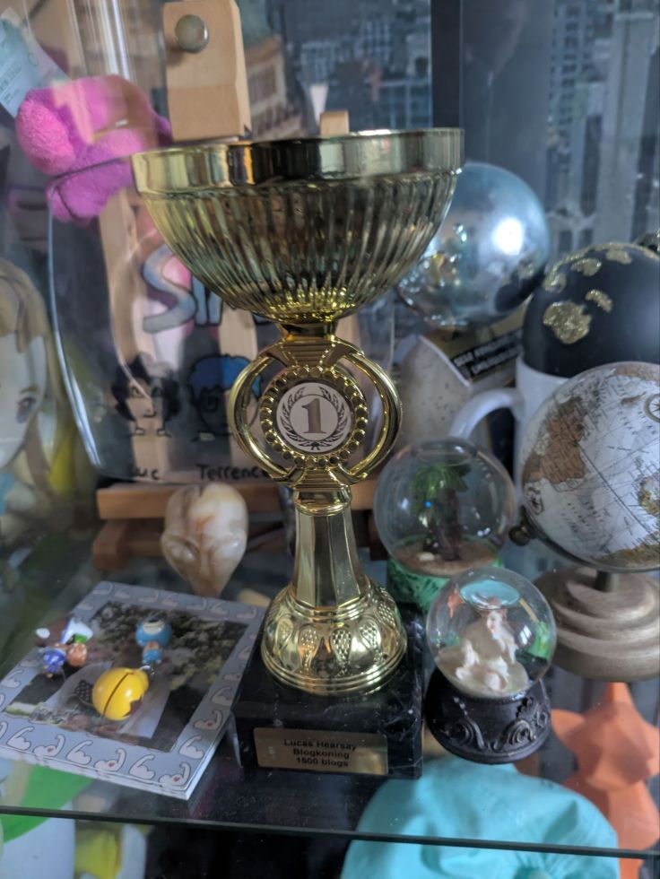 Maar goed, genoeg voor nu over mijn dag naar de stad vandaag; we spoelen even terug naar gisterenavond om 19:00 uur, of daaromtrent, toen kwam Mr. Maestro weer met mij sporten, wat op zich niet echt heel bijzonder is! Maar dit was dat wel; hij zei dat hij van de “Vereniging van Nederlandse Topbloggers” mij een prijs mocht uitreiken omdat ik al 1500 blogs had geschreven achter elkaar! En toen kreeg ik dus bovenstaande trofee! Dat was dus best wel een mokergrote verrassing, dat ik zomaar een trofee had gekregen van Mr. Maestro, en ik was ook extatisch van vreugde dat Mr. Maestro, sorry, ik bedoel de Vereniging van Nederlandse Topbloggers, mij een prijs uitreikten omdat ik op de 1500 blogs zat (of daar al overheen zelfs), maar dat is toch gewoon geweldig, dat ik een trofee had gekregen voor mijn schrijf- en blogkunsten! Nou, ik dus gelijk aan mijn broertje laten zien via WhatsApp, alleen gaf hij geen antwoord! En dat vond ik best wel jammer; aangezien ik hoopte dat mijn broertje ook best trots op me zou zijn! Maar goed; ik heb dus een trofee gekregen (wss van Mr. Maestro zelf)! Maar goed, ik vcind dit best wel een prestatie! 1500 blogs achter elkaar! Dus ik hoop dat ik nog lang dit blog kan blijven schrijven! Maar goed; ik ben dus best wel trots op mezelf dat ik zomaar van Mr. Maestro een trofee kreeg! Nou, Mr. Maestro zei dat hij dat in de toekomst nog wel vaker zou gaan doen, maar het dan niet zou aankondigen!