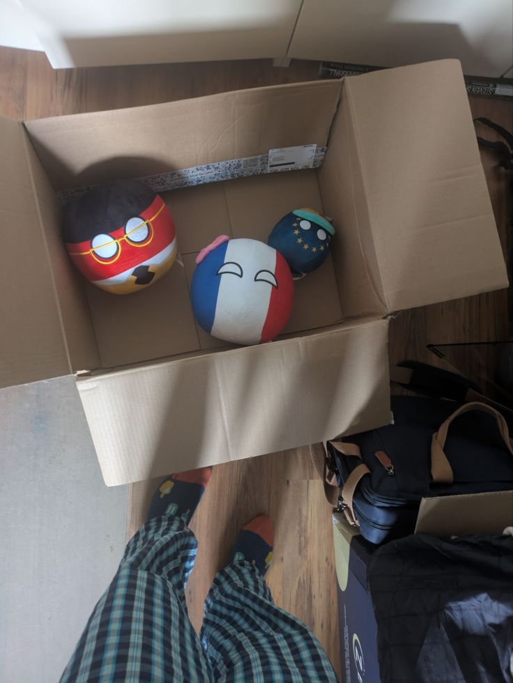 Drie Countryballs liggen in een verhuisdoos…… Het klinkt als het begin van een slechte mop zoals mijn vader die vertelt, maar het is echt zo, op dit moment liggen er echt drie Countryballs-pluches in een verhuisdoos! Waarom? Nou, die had ik in Januari besteld voor mijn housewarming, en wanneer komen ze binnen; nou…. een week voordat ik op mezelf ging wonen, en ik dacht dat mijn ouders heel boos zouden worden omdat er weer twee pluches binnen zouden komen! Maar toen ik uitlegde dat ze bedoeld waren voor mijn nieuwe huis, voor op de bank en ik ze al in Januari had besteld….. Nou, toen zag ik ze graven in hun hoofd en me daarna aankijken met zo’n blik van: “Oh ja, dat zou ook nog komen, hé?”! Terwijl ik had gedacht dat het letterlijk weer tot strijd zou leiden! Maar toegegeven, toen pa hoorde dat het DIE pluches waren; toen wilde hij ze wel even zien! Dus ik gisteren mokervaak van de zolder naar beneden gelopen; want ik had ze bij de rest gelegd omdat ik DACHT dat mijn ouders daar ook weer ruzie over zouden gaan maken! Maar nee; dat gebeurde niet; pa vroeg juist: “Mag ik ze zien?” En daarom liep ik gisterenmiddag van het kastje naar de muur (ofwel; van de zolder naar beneden) om de pluches te pakken! En…. Daarom, mogen jullie ze ook zien!