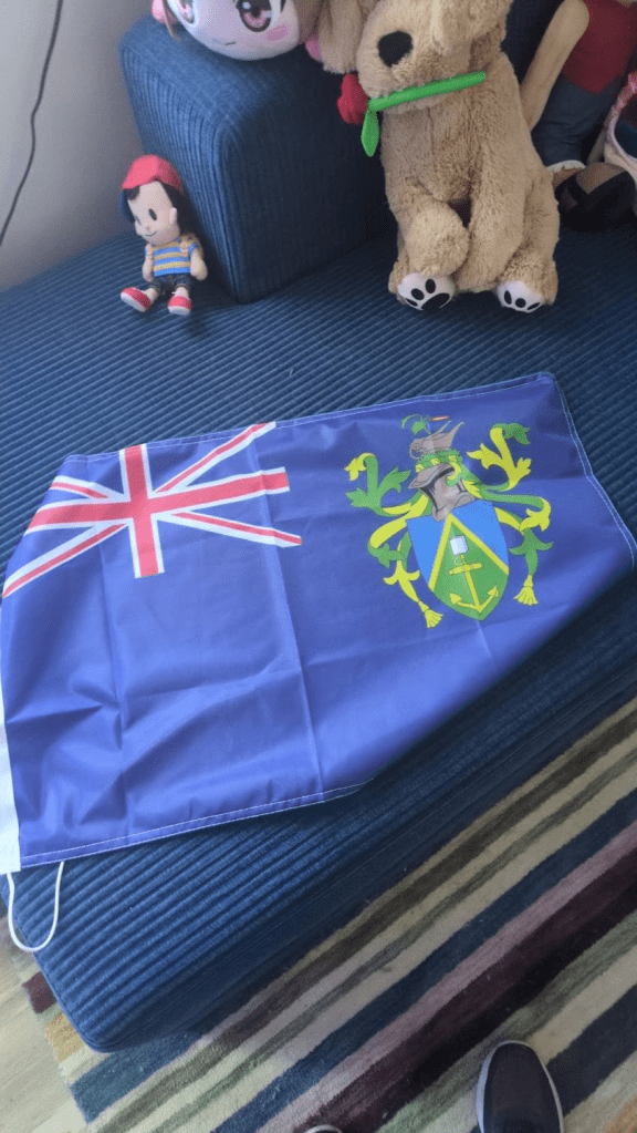 Want ja…. Zoals ik net al zei; Volgens de podcast Alle Geschiedenis Ooit is geen enkele studentenkamer compleet zonder; een BILLY-boekenkast; een POANG stoel, een LACK-tafeltje en een vlag! Maar waar veel andere studenten Een Ajax vlag Een Feyenoord-vlag Een PSV vlag Hier in de regio een NEC-vlag of Vitesse vlag! Een FC Barcelona vlag een vlag van een andere voetbalclub Een Pride vlag (uit de tienduizenden soorten die er nu bestaan) En vlag van een politieke beweging (vaak een linkse, zoals Communisme, Anarchisme, de USSR, of Noord-Korea, ook al zijn die twee verre van links! Soms de Nazi-vlag als je echt pech hebt) Een vlag van een biermerk of zoiets aan de muur hebben hangen! Heb ik…. de Pitcairn-vlag! En dat is toch wel echt uniek en typisch iets voor mij! Want ik heb geen politieke ideologie of voetbalclub of biermerk waarmee ik me identificeer; maar wel mokertjeveel inside jokes die ik heb met anderen, waaronder dus Pitcairn en haar koppelen aan rar/vreemde mannen terwijl zij met een cveleb wilde in De Sims met Zeefscheef, Wereldbol van Aukje Fijn met een aantal mensen in mijn familie (neef, nichtje), haaien en Jaws en de personages in mijn verhalen Igor en Sergei met Prof. Dr. Haaienfin, de Groene Kliko van Niko (oorspronkelijk met Zeefscheef en Schiereiland, nu met mensen die mijn “Paul uit het boek Obsessie van Joost Heyink is your roommate”-verhalen kennen die begonnen met Paul die een brief ontvangt van de woningbouw dat ze mij bij hem in het appartement plaatsen!), Aukje Fijn als geheel, en zo heb ik nog wel meer in-jokes die tegenwoordig meer persoonlijkheidskenmerken zijn! En daarom vind ik het nu ook gewoon vet dat ik die Pitcairn-vlag aan de muur heb hangen, of nou ja, aan de muur ga hangen, want nu ligt ie nog op mijn bankje!
