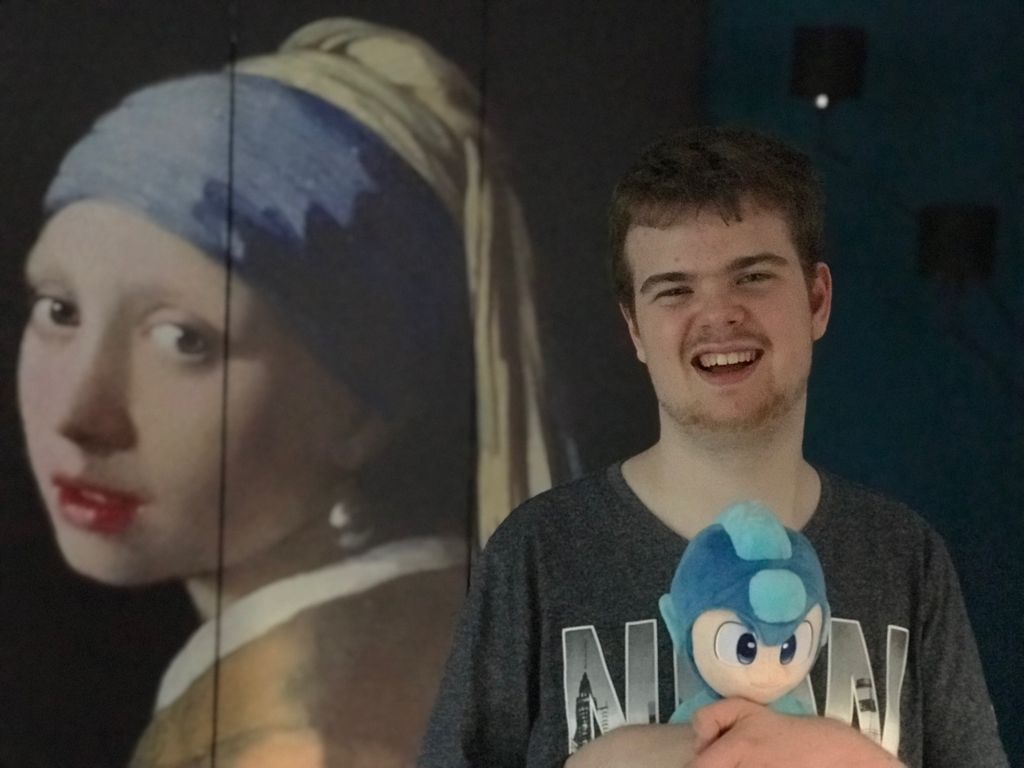 Dus nu heb ik thuis maar een foto met mijn nieuwe knuffel Calem Kuijpers gemaakt, waarbij ik voor de plaat sta van het Meisje met de Parel die mijn ouders in de woonkamer hebben. Want die vonden het te veel werk om naar een bushokje of een reclamebord te lopen!