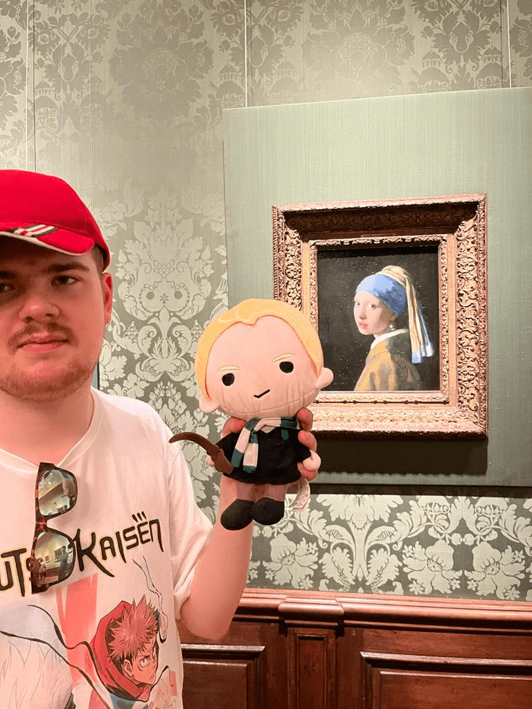 Op een gegeven moment kwamen we in een gamestore en daar zag ik een pluche die ik graag wilde hebben, maar ik herinnerde de deal met mijn ouders, en dus moest ik even mijn financiële adviseur (mijn vader) bellen om te vragen of het mocht! Maar ik kreeg steeds VoiceMail……. En toen we wat zaten te drinken belde mijn vader terug en zei hij dat het mocht! Bedankt pa! Dus weer terug naar die Gamestore en plushie kopen, en daarna gingen we naar het Mauritshuis, waar we toevallig langskwamen en het mij wel een leuk idee leek om het Meisje met de Parel even hallo te zeggen! En ik had op elk schilderij wel commentaar (en grapjes)! Hieronder zijn er een paar uitgelicht!